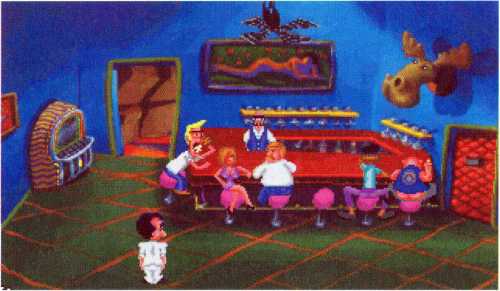 Erst einmal das, was man in einer Bar für gewöhnlich macht, nämlich einen kippen. Larrys Lieblingsgetränk ist übrigens Whiskey, wie es sich für einen Amerikaner auch gehört. Der Wirt schenkt übrigens nur aus, wenn Sie sich vorher an die Theke gesetzt haben. Mit den Gestalten an der Theke können Sie sich auch unterhalten, aber das bringt nichts. Die Musikbox hinten in der Ecke könnten Sie auch anschmeißen, hilft Ihnen bei der Lösung des Spiels aber auch nicht. Die Tür rechts