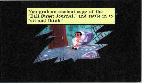 Die nächste Tür leitet den Abenteurer zur Toilette. Die Sitzung kann beginnen. Larry setzt sich erst einmal auf die Schüssel und liest das Ball-Street-Journal. Nachdem er es durch hat, schaut er sich noch die Sprüche an den Wänden an und stößt dabei auf ein Codewort: Ken sent me.