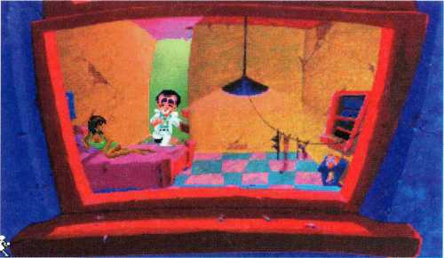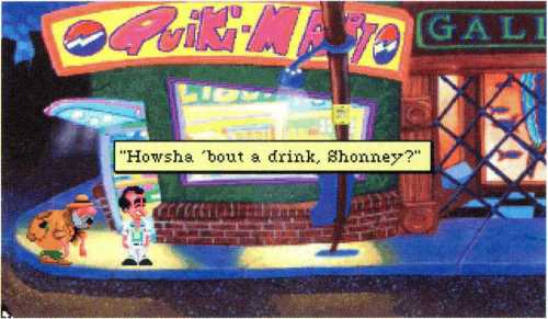 Da noch immer die gleichen Gestalten an der Theke sitzen, schaut sich der kleine Mann noch einmal um und entdeckt dabei die Tür mit dem Guckloch rechts neben dem Ausschank. Larry klopft an, und eine Stimme von der anderen Seite fragt nach dem Codewort. Da dem Helden des Abenteuers nichts einfällt, außer dem Spruch vom Klo, sagt er diesen auf.