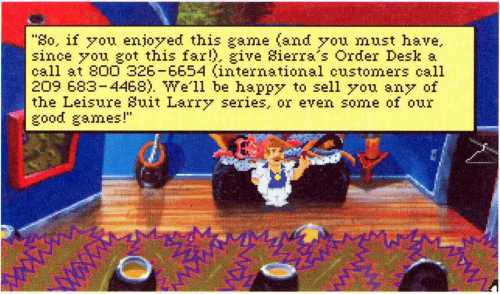 Zunächst einmal natürlich die Nummer von Sierra On-Line. Aber das ist nicht unbedingt notwendig. Die anderen Telefonnummern erfahren Sie während des Spielverlaufs. Die Nummer der National Quicki-Sex Survey Hot Line finden Sie an die Wand der Telefonzelle geschrieben. Aus einer Radiowerbung können Sie die Nummer des Ajax Liquor Store erfahren. Sollten Sie einen der Anschlüsse anwählen, obwohl Sie die Nummer noch gar nicht aus dem Spiel kennen können, werden Sie lediglich ein Besetzt-Zeichen zu hören bekommen.