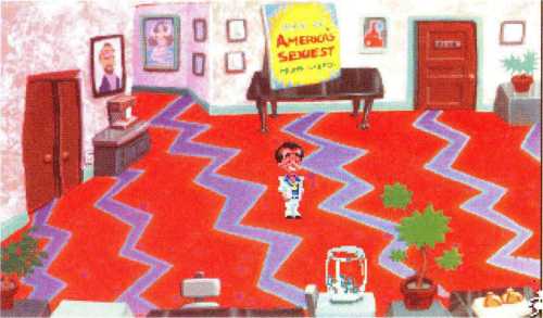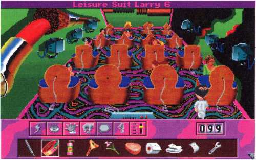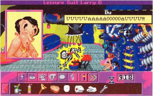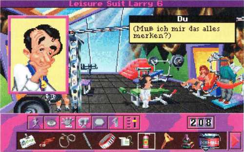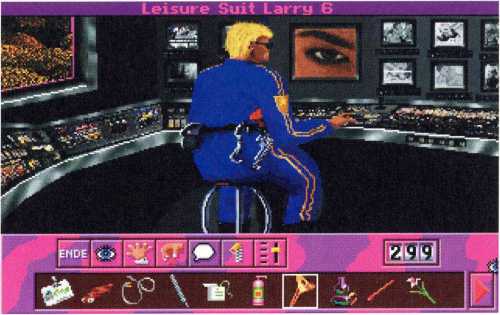 Zwar gelangt er so in den Raum mit dem riesigen Typen vor einer Treppe, aber an ihm leider nicht vorbei. Satte zweihundert Mäuse will der Kerl haben, damit er Larry die Treppe hinauf läßt. Zu viel. Aber Larry ist ja nicht dumm und schaltet mit seiner Fernbedienung, die er bei sich trägt, so lange herum, bis er einen Sexkanal erwischt. Der Schläger hat so etwas wohl noch nie gesehen und achtet gar nicht mehr auf die Treppe. Larry nutzt die Chance und schleicht sich nach oben.