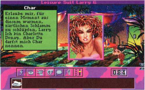 Zwar wird in dieser Disco nicht sonderlich viel getanzt, aber dafür gibt es hier ein recht hübsches Mädel aufzureißen. Setzen Sie sich doch in den einzigen noch freien Sessel zu der Frau. Larry weiß sicher, wie man mit so einem heißen Eisen umgeht.